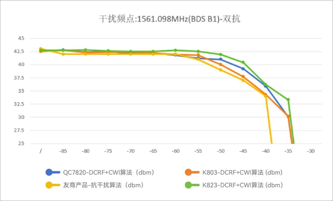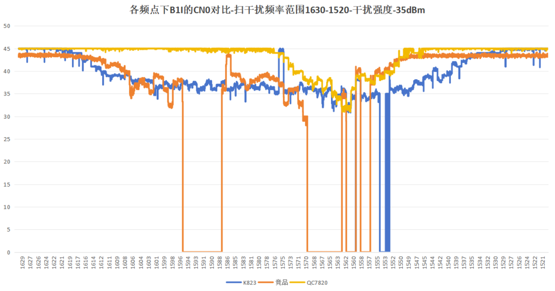 3.2 扫频干扰测试: 动态环境的真实挑战 扫频干扰模拟的是频率快速变化的电磁环境,如车载雷达、通信基站切换或恶意扫频攻击。本次测试选取两段扫频范围:1559~1563 MHz与1573~1577 MHz,覆盖BDS B1和GPS L1邻近频点。结果呈现出更为复杂的曲线特征:在1573~1577 MHz扫频段中,友商模组前期表现较强,但在干扰功率超过-25 dBm后迅速下滑,最终低于QC7820和K823;QC7820整体表现平稳,虽未在初期领先,但在高干扰区保持曲线平直,没有明显塌陷;K823则在后期表现略优于友商,但整体波动较大。在1559~1563 MHz扫频段中,友商模组在底点和高点均占优,但稳定性差,曲线在高干扰区出现明显波动。QC7820与K823表现接近,但QC7820的曲线更平滑,说明其在动态干扰下的自适应算法反应更为迅速。