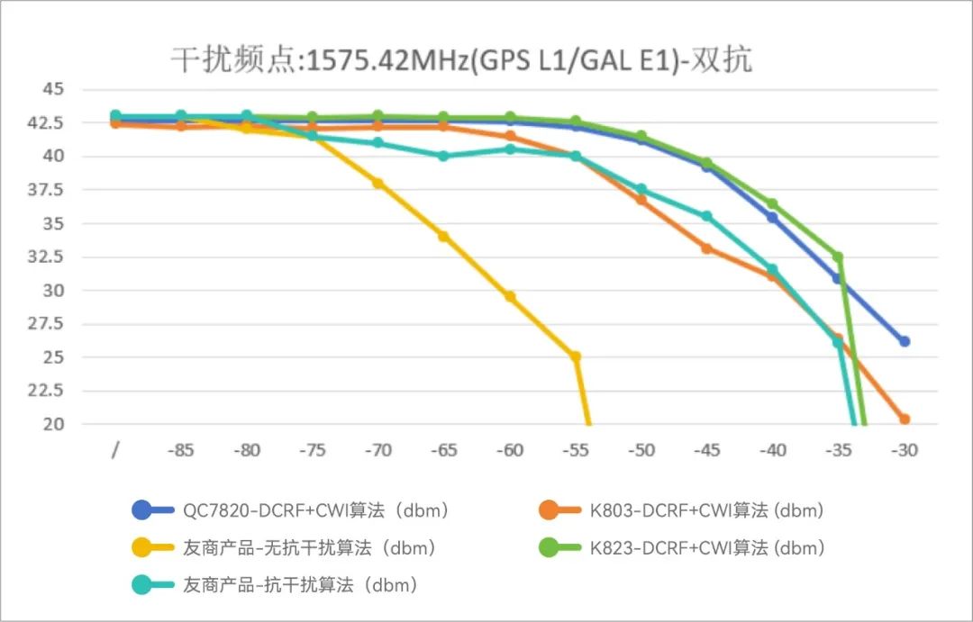 核心导读 微弱信号的守护战 全球卫星导航系统(GNSS)早已融入无人机、电力巡检、车载导航等领域的基础设施。然而,卫星信号在两万公里外传输至地面时,功率常低至-160 dBm,仅相当于一片落叶轻轻触碰大地的能量。这样的信号一旦遇上窄带噪声、连续波甚至扫频干扰,便可能瞬间“失明”。在复杂电磁环境日益普遍的今天,芯片抗干扰性能已不再是锦上添花,而是保障定位可靠性的核心竞争力。 本期司南技术π聚焦司南导航最新一代QC7820芯片,通过多维度实测,将其与友商模组产品及K823模组进行横向对比,深入剖析其抗干扰表现背后的架构优势及行业意义。 Part 1 技术背景 从北斗三号到抗干扰芯片演进 北斗三号系统在2020年全面建成,实现全球覆盖,这标志着中国导航技术进入新的高度。然而,地面应用环境却愈加复杂,城市的电磁污染、汽车发动机和通信设备辐射,甚至恶意干扰源,都可能让终端定位精度急剧下降。抗干扰技术由此从“可选项”变成了“必选项”。 地面应用环境日益复杂,让终端定位精度面临严峻挑战 GNSS抗干扰主要分为窄带干扰抑制(CWI)与连续波干扰抑制(DCRF)两大技术路线。前者基于快速傅里叶变换(FFT)在频域检测并滤除干扰,适合窄带干扰,但功耗较高;后者则在时域进行连续波检测与抑制,响应快、功耗低,却无法覆盖所有干扰类型。近年来的趋势是两种技术融合使用:通过双通道架构,让芯片同时具备快速响应与广谱防御的能力。 Part 2 测试报告与功能分析 本次测试围绕三个核心场景展开:单音双通道抗干扰全开、抗干扰关闭基线,以及扫频干扰环境。测试方法严格控制变量,使用信号模拟器输出导航信号,与信号发生器叠加干扰,逐级提升干扰功率,实时记录载噪比(CN0)与失锁点。 测试对象包括三类:QC7820芯片(司南导航第四代核心芯片,支持双通道CWI+DCRF协同)、友商模组产品(主流GNSS模组,无双通道抗干扰设计)、K823模组(基于司南导航第三代核心芯片开发,具备部分抗干扰功能)。 3.1 单音双通道抗干扰全开: 稳定性与极限的双重考验 在抗干扰算法全开条件下,将干扰频点设置为1561.098 MHz(BDS B1)和1575.42 MHz(GPS L1/Galileo E1),逐步增强干扰功率,可清晰观察三款芯片的抗干扰曲线。QC7820在两个频点的表现都保持高度一致:干信比下降缓慢,直到干扰功率达到-35 dBm时,仍能稳定追踪信号。相比之下,K823在相同功率下已出现明显的载噪比衰减,而友商模组更早进入性能崩塌区。值得注意的是,QC7820的双通道架构在面对多频点同时干扰时尤为突出——两通道协同开启后,可以在不显著增加功耗的前提下维持定位精度。