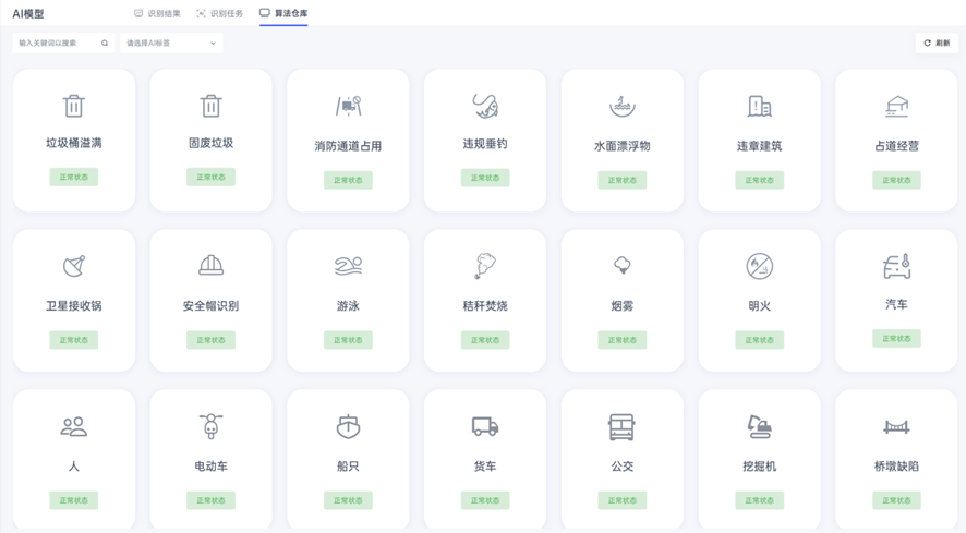 如果说无人机是穿梭于城市上空的 “千里眼”,那么30余种 AI 算法便是赋予其“智慧大脑”的核心动力。星图智慧基于“数智城市时空大数据中台”AI大模型能力,实现了污水识别、交通拥堵识别、道路积水识别、漂浮物识别、拉横幅告示识别、道路缺陷识别、人群聚集识别、边坡缺陷识别、裸土未覆盖识别、建控区违建识别、固废垃圾堆放识别、水面违规搭建识别、秸秆焚烧识别等多元算法,实现了巡检问题的实时智能识别与精准分析。