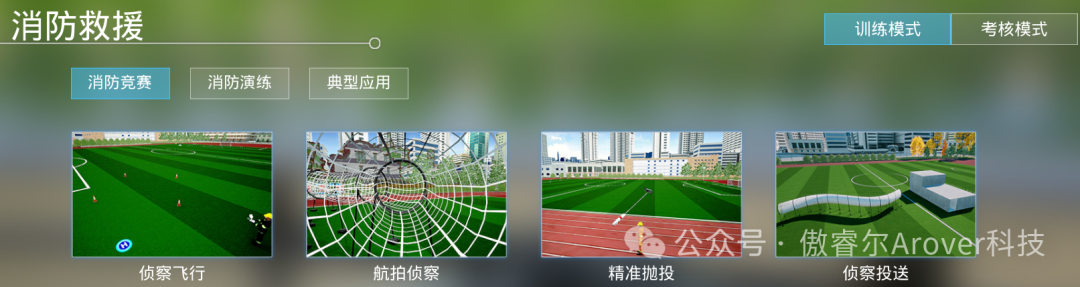 消防竞赛模块:此模块精心参照消防行业各类高规格竞赛标准设计,全面涵盖了航拍侦查、侦查投送,以及精准投送,等关键任务内容,旨在全方位提升消防人员在无人机操作方面的竞技水平与实战能力。