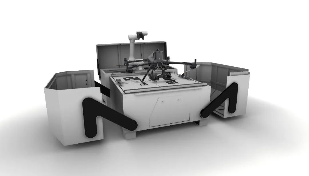 机场搭载高精度换电系统,通过高精度机械臂精准识别并抓取无人机电池,快速完成耗尽电池取出与满电电池安装。机场本体配备多仓位智能电池仓,支持电池的集中存储、充电与调度管理,实现无人化、高效率的能源自动更换,有效突破续航限制,为规模化、连续性作业提供坚实可靠的支撑。