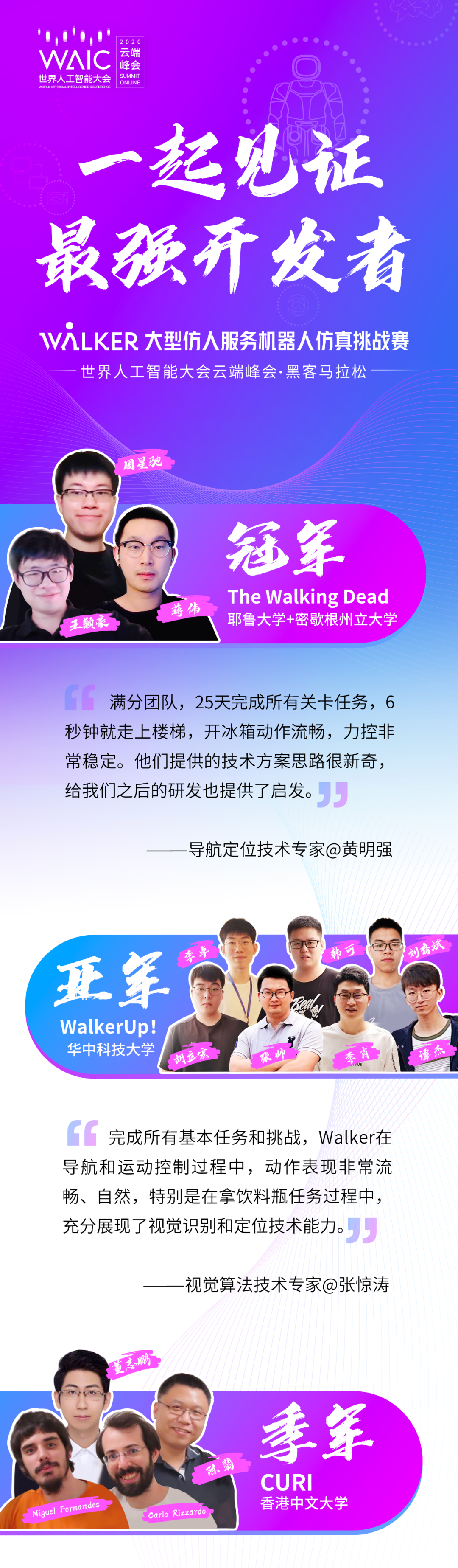 经过1个多月紧张的启动、报名、初赛、决赛,最终获奖名单刚刚在大会开发者日主论坛上公布,来自耶鲁大学、密歇根州立大学的The Walking Dead开发者团队在25天内完成所有关卡,以355满分成绩夺冠。具体如下: