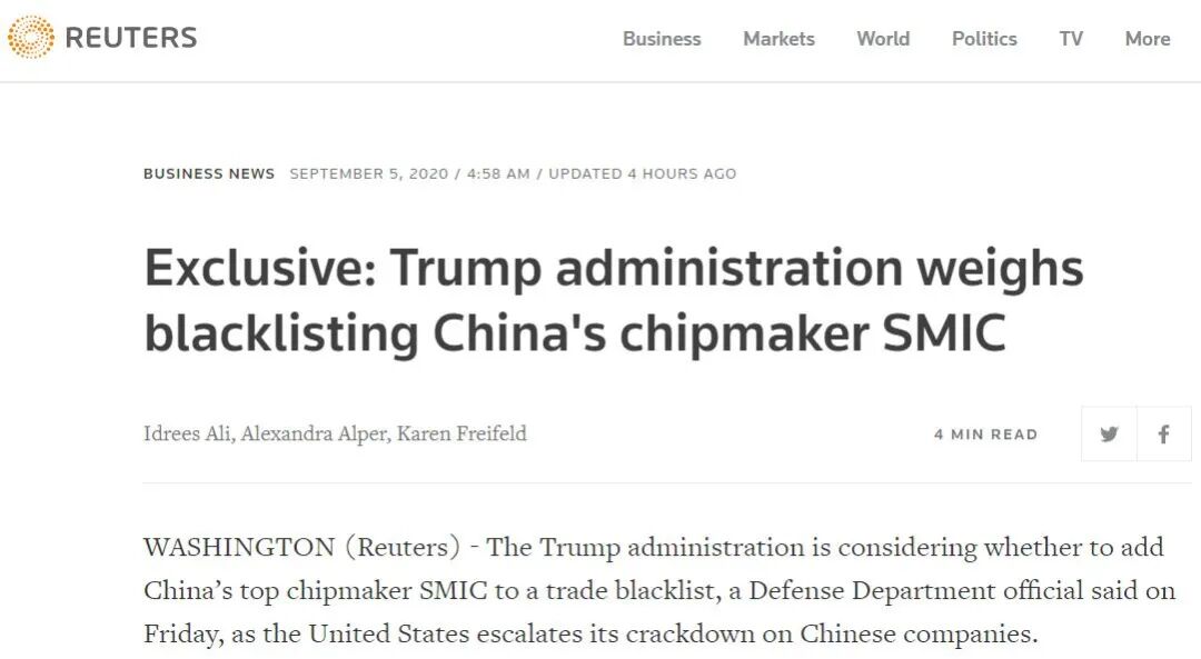 美东时间9月4日(北京时间9月5日上午4:53),路透社援引美国防部一位发言人表示,其正在与其他机构合作,决定是否将中芯国际列入实体企业名单。另据消息人士透露,五角大楼本周已提交一份建议给美国商务部等相关部门,最终中芯国际是否列入实体名单,需由商务部等确定。