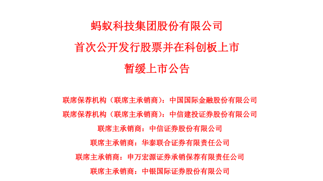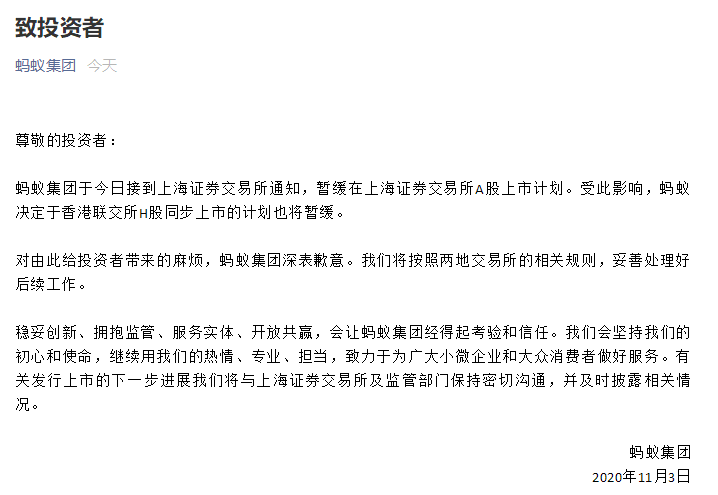 蚂蚁集团于今日接到上海证券交易所通知,暂缓在上海证券交易所A股上市计划。受此影响,蚂蚁决定于香港联交所H股同步上市的计划也将暂缓。