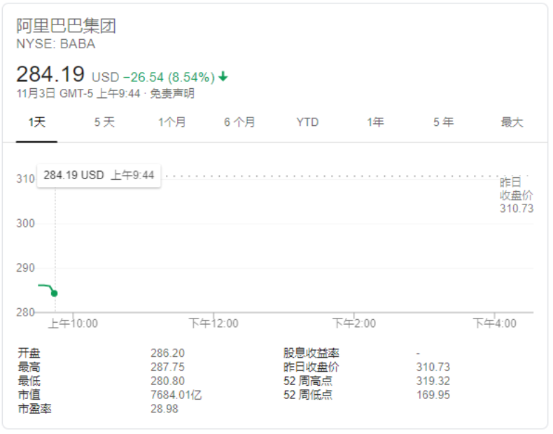 截止发稿前,阿里巴巴集团市值下跌超8.5%。