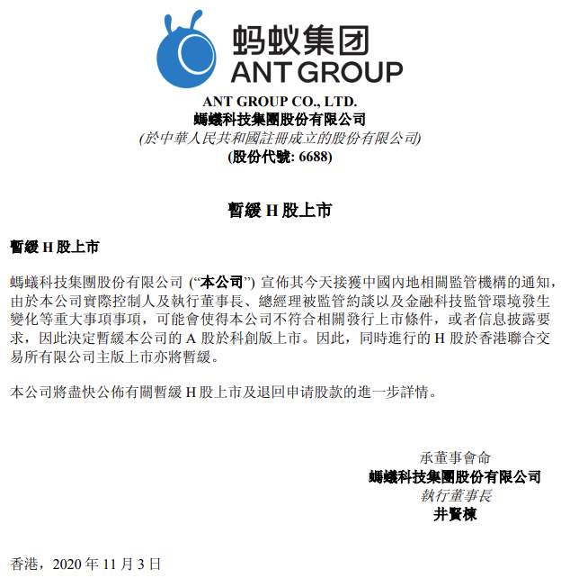 11月3日晚间,上交所发布公告称,2020 年 11 月 2 日,中国人民银行、中国银保监会、中国证监会、国家外汇管理局对发行人实际控制人马云、董事长井贤栋、总经理胡晓明进行了监管约谈。金融科技监管环境也发生了变化。相关事项可能会使得发行人不符合上交所科创板相关发行上市条件或者信息披露要求。暂缓蚂蚁科技集团股份有限公司上市。