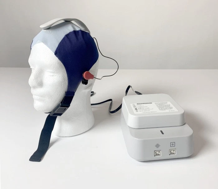 这款耳机看起来像一顶游泳帽,大约需要3分钟时间来配置,它使用了沿中线Fz、Cz和Pz的三个传感器(用于评估奖励和认知功能的关键通道或电极)。配备可支持32个通道的生物放大器,可用于采集静息状态脑电图和事件相关电位,并通过软件对脑电图测量任务进行时间锁定。