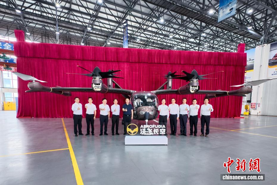中新社记者 刘忠俊 摄 9月29日,面向低空出行的大型载人eVTOL(电动垂直起降飞行器)AE200-100首架机在四川成都正式下线。这标志着AE200-100首架机已完成机体大部段对接与核心机载系统安装工作,正式迈入适航取证冲刺与量产机型