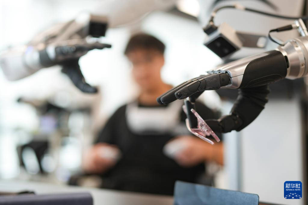 9月23日,工作人员在专用场景采集区操作机器人收放眼镜。 为探索具身智能机器人在工业场景中的应用,位于浙江绍兴上虞区的杭州湾具身智能创新中心根据真实作业流程搭建数据采集场景,开展机器人作业模型训练,为具身智能机器人进入真实生产线积累实操经验