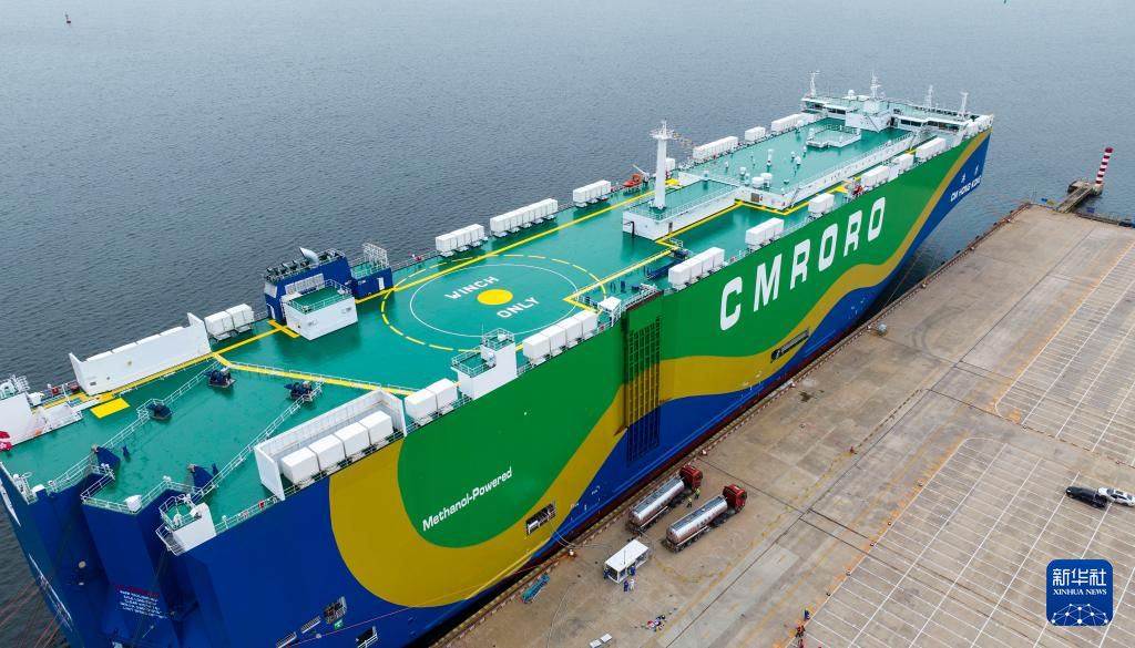 9月22日,在天津港环球滚装码头,汽车滚装船“港荣”轮进行甲醇加注作业(无人机照片)。 9月22日,甲醇双燃料动力汽车滚装船“港荣”轮靠泊天津港环球滚装码头,并进行了300吨国产绿色甲醇岸基加注作业,这标志着天津港已具备规模化供应绿色甲醇能