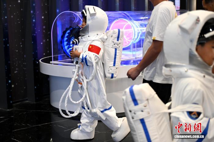 8月5日,市民在福州市科技馆参观,体验和感受科技的神奇,在玩乐中增长知识,丰富暑期生活。图为小朋友身穿宇航员服饰在馆内参观。中新社记者 吕明 摄