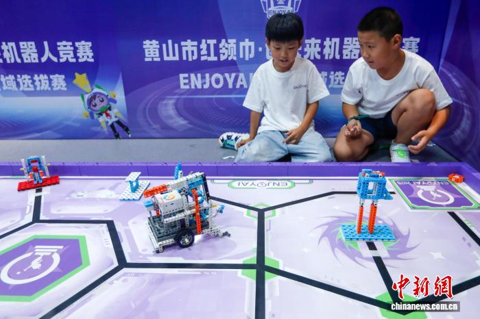 8月10日,黄山市红领巾·创未来机器人竞赛ENJOYAI(皖南区域选拔赛)在安徽省黄山市科技馆开赛,来自黄山、宣城、铜陵、芜湖、合肥等地的100余名选手参加。赛事设置多重创意关卡,为参赛选手提供展示、比拼、交流的平台。图为参赛选手在竞赛中。