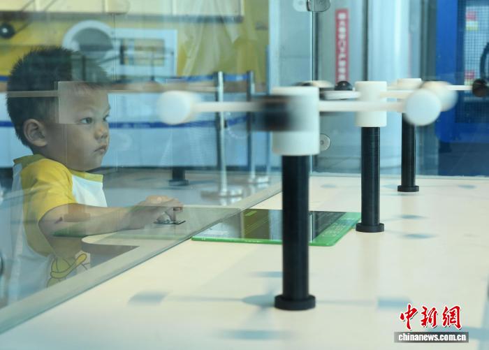 8月21日,正值暑假,重庆科技馆变身儿童乐园,吸引不少市民带着小孩前来参观、游玩,探索科学奥秘。图为一名小朋友观看形状与空气阻力实验。中新社记者 周毅 摄