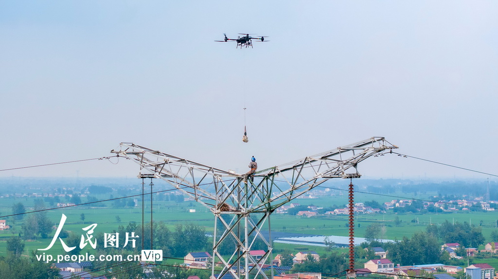 江苏淮安:无人机助力电网不停电检修 8月6日,在江苏省淮安市500千伏旗潘/杰潘输电线路施工现场,电力工人运用中型多旋翼无人机进行不停电安装防鸟装置作业。该技术通过无人机精准投放防鸟装置,显著提升了作业效率和安全性,避免了传统停电作业对居