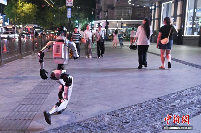 8月19日,人形机器人在街头“奔跑”。当日,浙江杭州西湖附近街头,一台人形机器人在工作人员监控下进行“逛街”展示,吸引民众关注。据介绍,该机器人搭载智能化模块后具备自主导航、避障等功能。中新社记者 王刚 摄