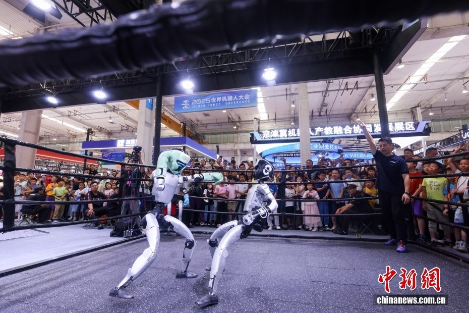 中新社记者 贾天勇 摄 8月11日,2025世界机器人大会继续在北京亦庄举行,展出的各类机器人刮起运动旋风。图为人形机器人上演综合格斗表演赛。