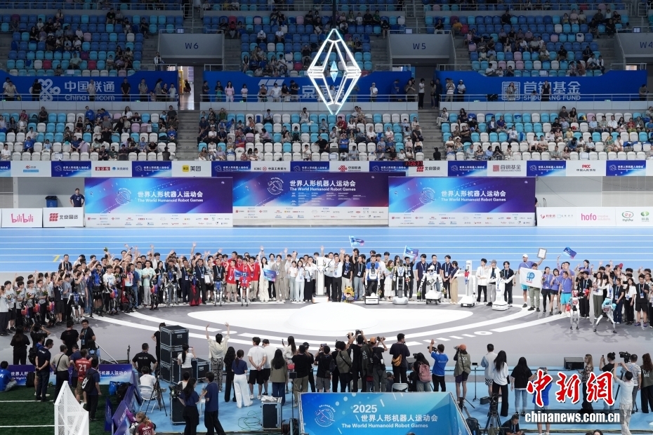 中新社记者 张祥毅 摄 8月17日,2025世界人形机器人运动会在北京国家速滑馆(冰丝带)闭幕。图为26个冠军集体亮相。