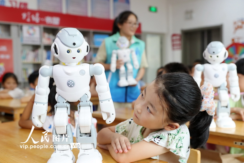 8月4日,在山东青岛莱西市河头店镇龙泉湖新村小雨滴暑假公益课堂,返乡大学生和青年志愿者为村里小朋友们带来一堂别开生面的机器人科普课。通过讲解原理与未来应用、模型展示及机器人、机器狗表演,让小朋友们零距离体验科技魅力,点燃创新梦想。张进刚摄(