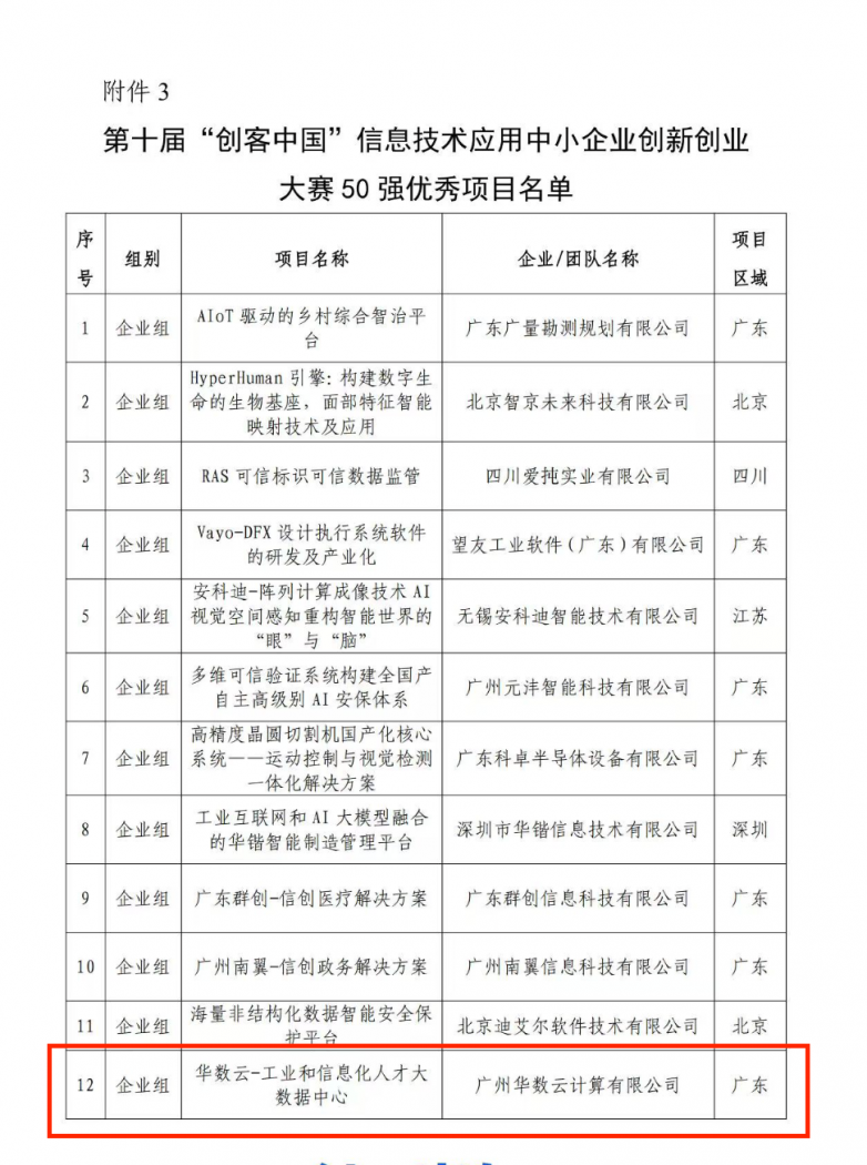 近日,第十届“创客中国”信息技术应用中小企业创新创业大赛评选结果揭晓,广州华数云计算有限公司核心项目——数云云聘AI人才服务项目凭借其在人工智能与人才服务领域的创新成果,成功晋级全国50强。